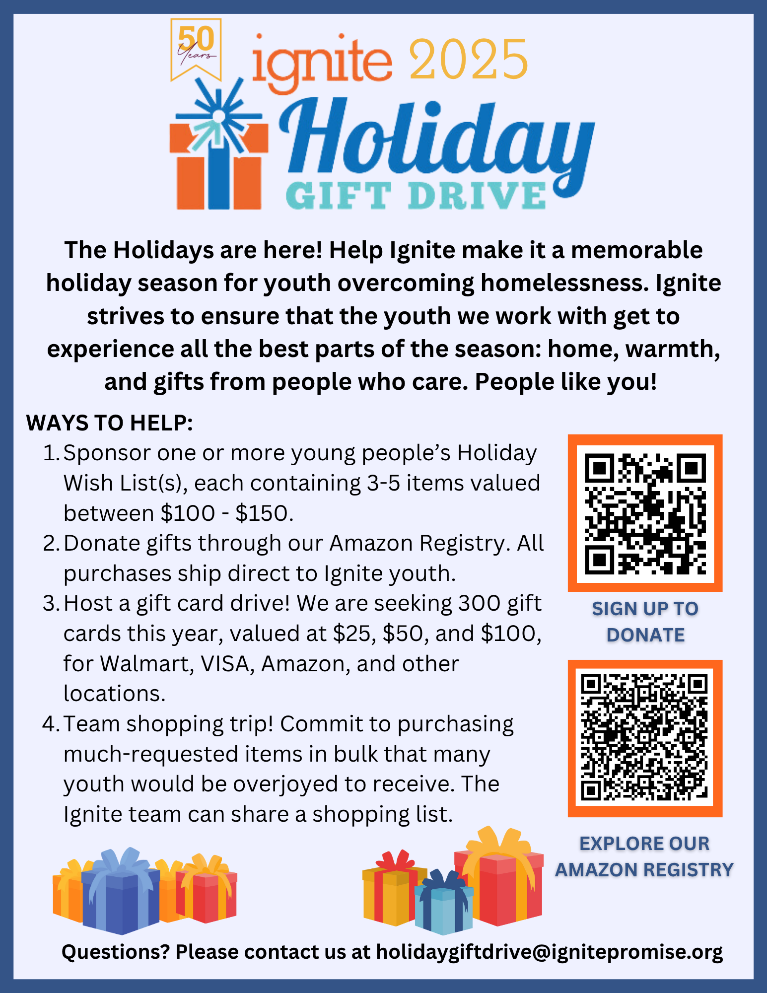 Interested in donating? Questions or concerns? Contact us at holidaygiftdrive@ignitepromise.org.